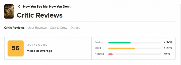 电竞日报11月12日播报讯 《惊天魔盗团3》口碑现已解禁。截至发稿,该作M站媒体均分为56分,其中5家媒体给出好评,6家媒体给出中评,1家媒体给出差评。