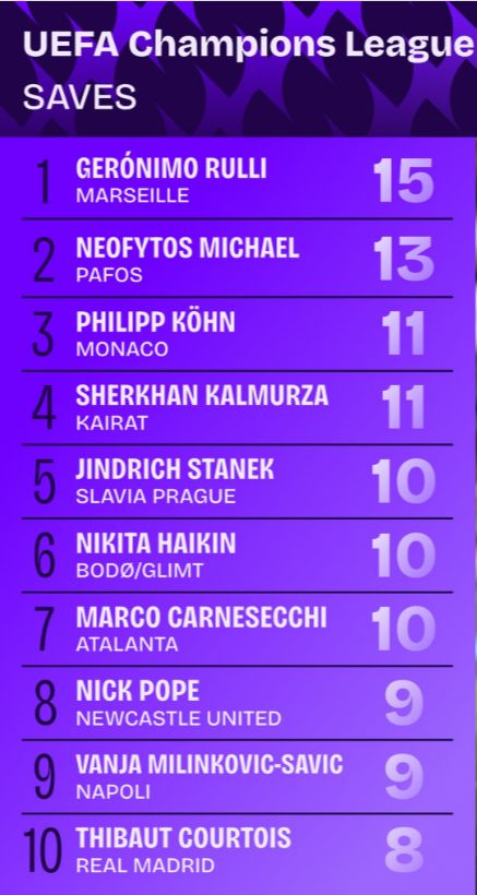 10月2日西甲日报讯 本赛季欧冠联赛阶段已战罢2轮,相关数据机构统计了本赛季欧冠截止目前的门将扑救次数榜。马赛门将鲁利以15次扑救独自领跑,纽卡门将波普和那不勒斯门将萨维奇并列第8,皇马门将库尔图瓦8次扑救排名第10。